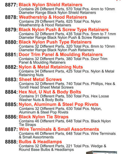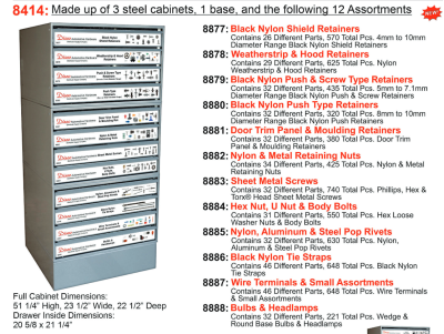 - Push Retainers, Screws, Tire Straps, "U" Nuts